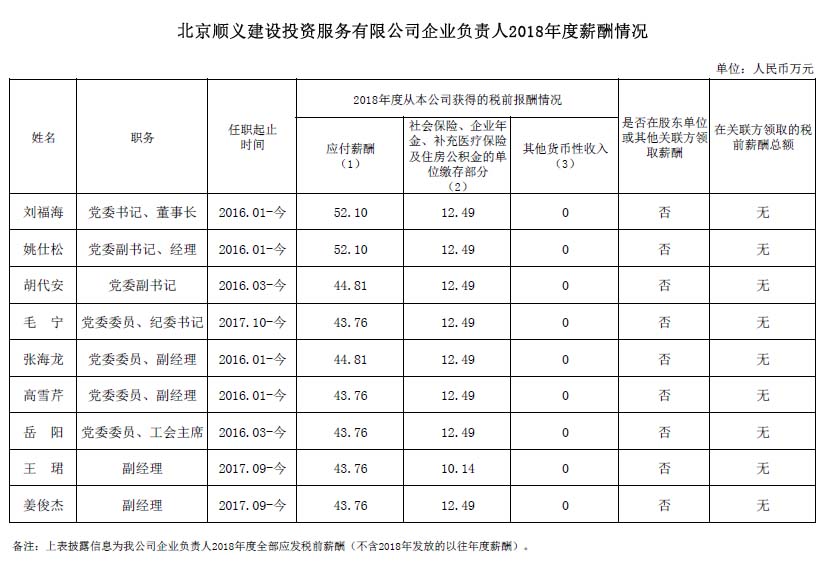 北京順義建設投資服務有限公司企業(yè)負責人2018年度薪酬信息披露
